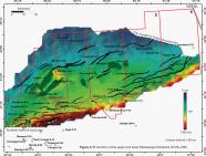 Rifting of the Scotian Margin began in the Middle Triassic and continued into the Early Jurassic forming a widespread region of horsts and grabens throughout the central and northeast Scotian Margin. A time-structure map of a time-transgressive seismic horizon interpreted to be late synrift to early postrift in age (~J200) defines the basement structure beneath the parcels (Figure 2.3). Figure 2.4 summarizes the most important basement features, which were used to refine the boundaries of known (e.g. Sable, Abenaki) and newly named (e.g. Huron) subbasins relative to Late Triassic to Middle Jurassic depocenters.